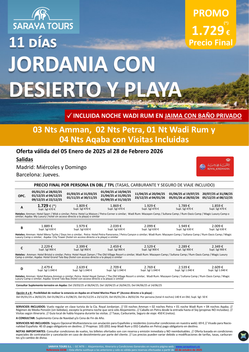 Jordania, Desierto y Playa 11 días: Amman, Petra, Wadi Rum, Aqaba con Visitas hasta Feb 27