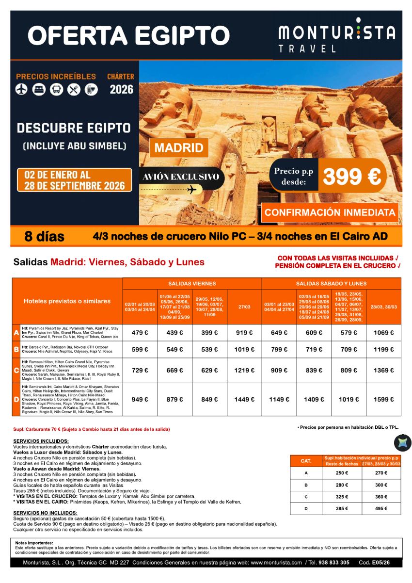 Descubre Egipto (Incluye Abu Simbel) ***desde 399€-salidas desde MAD,BCN,Agp,Bio,Vlc crucero + cairo + visitas