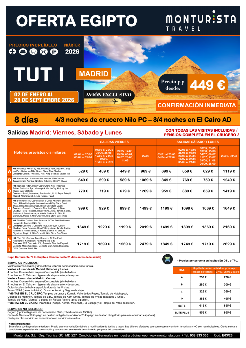 TUT I***desde 449 €- salida charter MAD vier,sab,lun BCN lun,especiales Agp,Vlc, Bio crucero + Cairo+ visitas